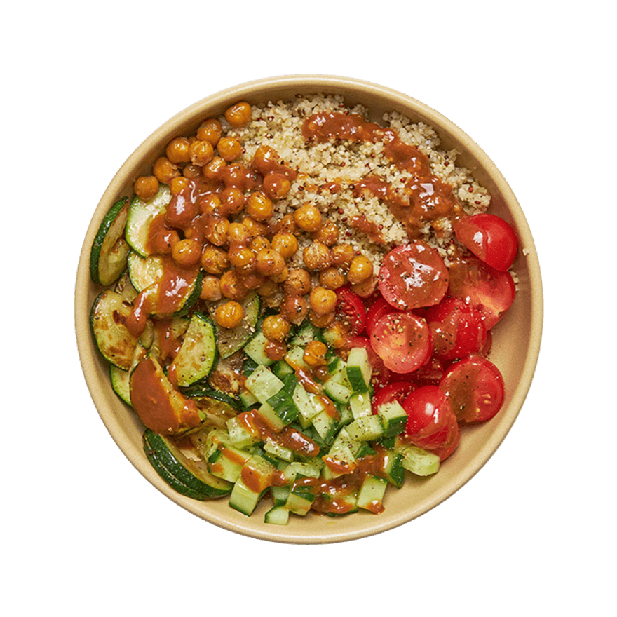 Dans un bol ou une assiette creuse, servez le mélange de céréales avec les tomates cerises, le concombre, les courgettes grillées et les pois chiches croustillants. Ajoutez la sauce satay et re-assaisonnez selon vos goûts. C'est prêt !